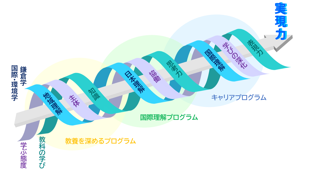 鎌倉女学院の学びの2つの軸である「教科の学び」と「鎌倉学/国際・環境学」、そして鎌倉女学院ならではの多彩なプログラムが