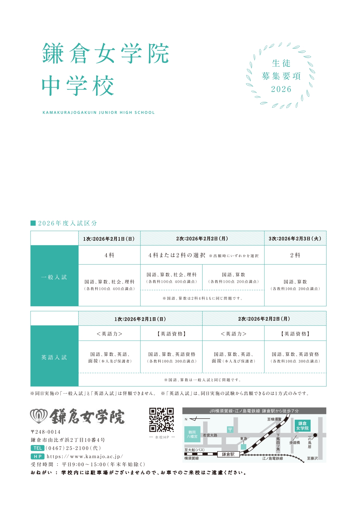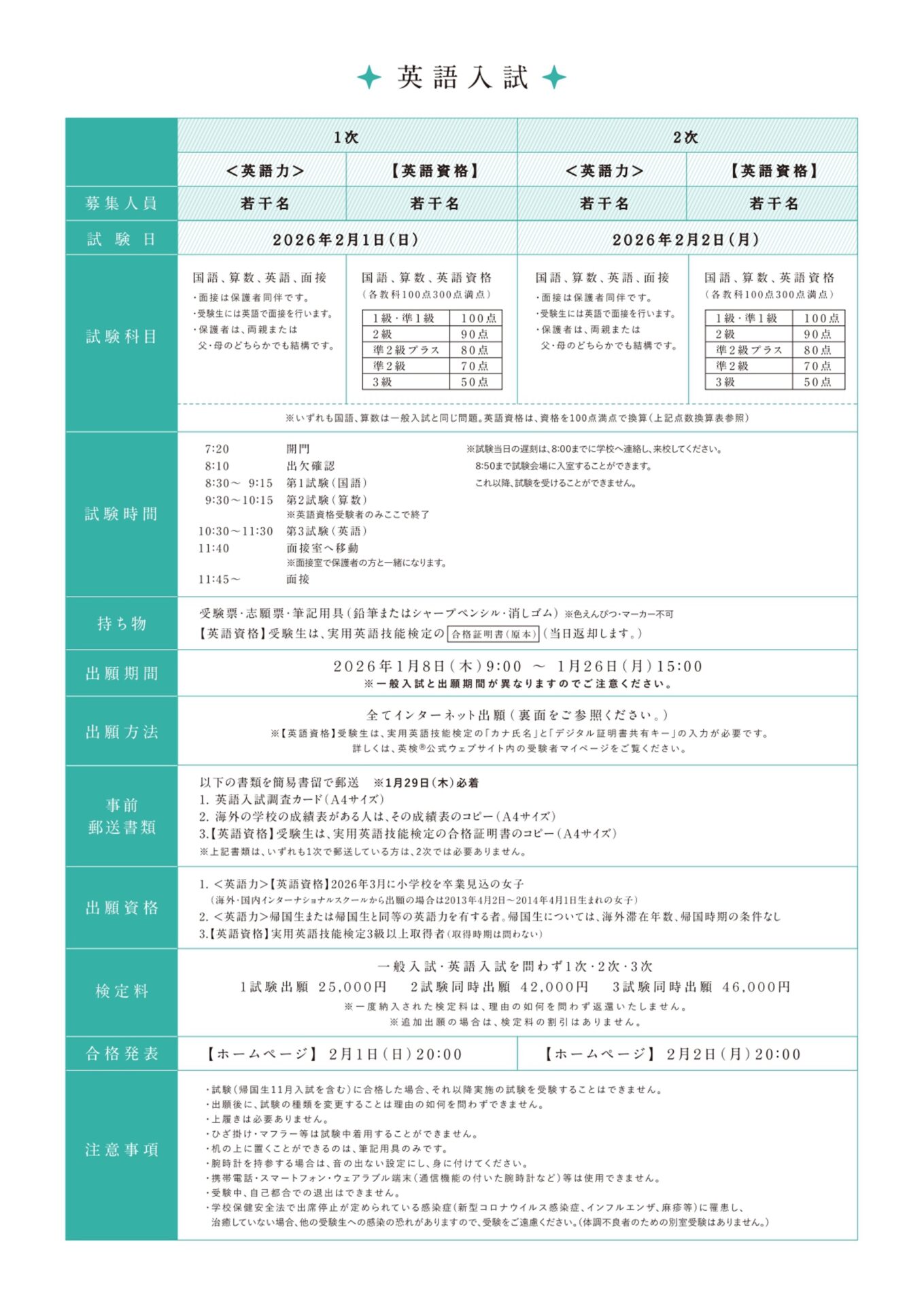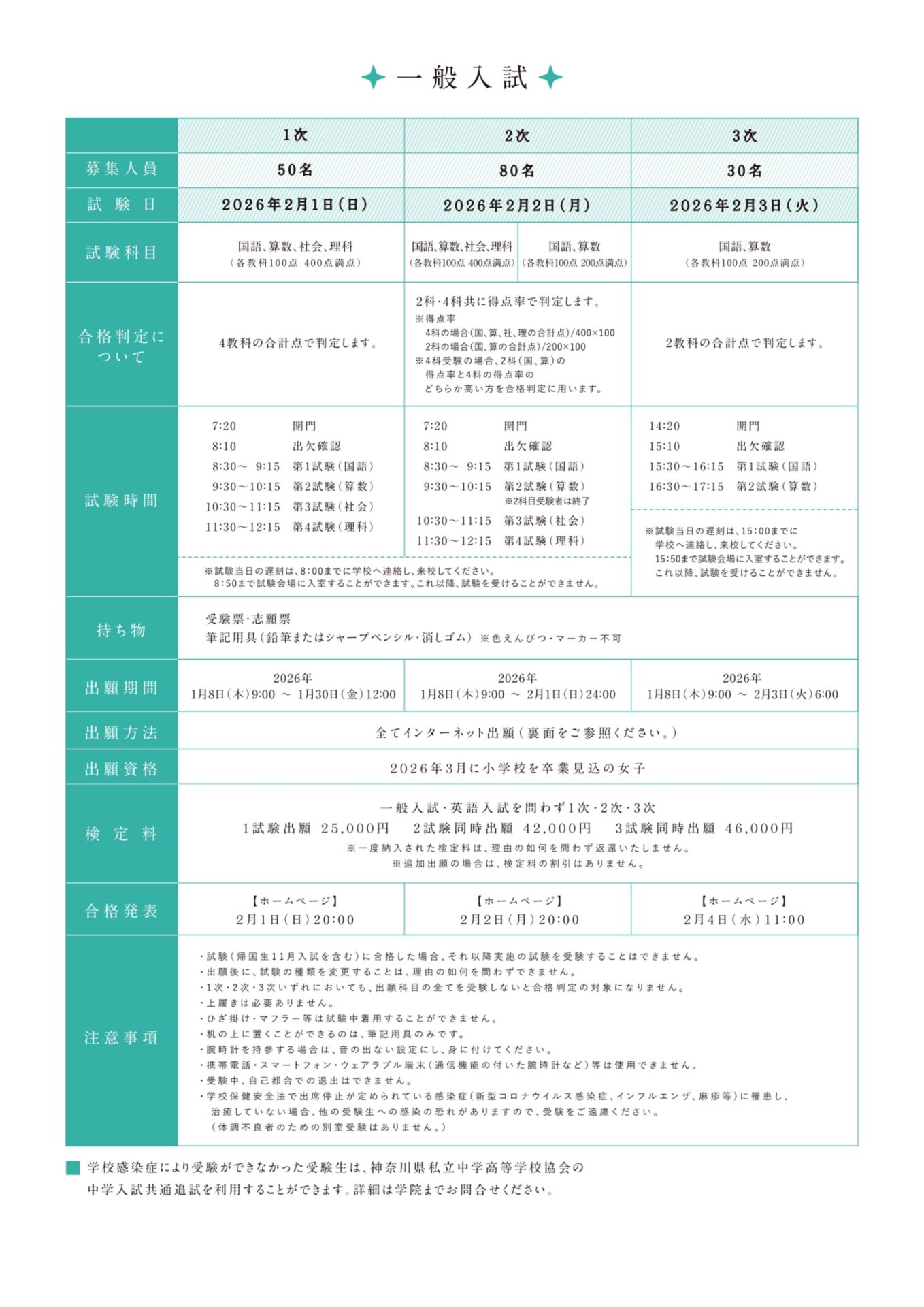 ・学校保健安全法で出席停止が定められている感染症(新型コロナウイルス感染症、インフルエンザ、麻疹等)に罹患し、治癒していない場合、他の受験生への感染の恐れがありますので、受験をご遠慮ください。